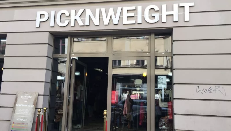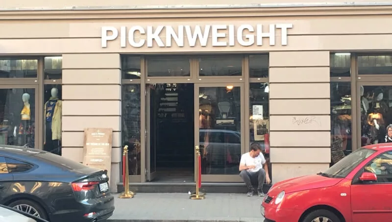 El local es uno más a unas pocas cuadras de Alexanderplatz, el “centro” de Berlín. Por fuera ya se da a conocer cómo es la modalidad de Picknweight: diferentes colores, diferentes pesos, diferentes precios.