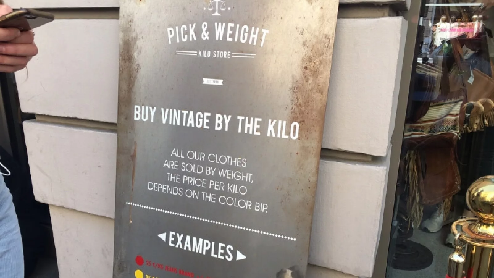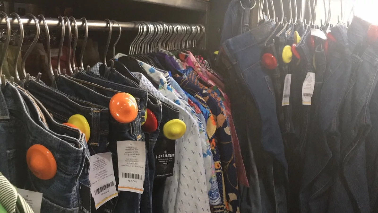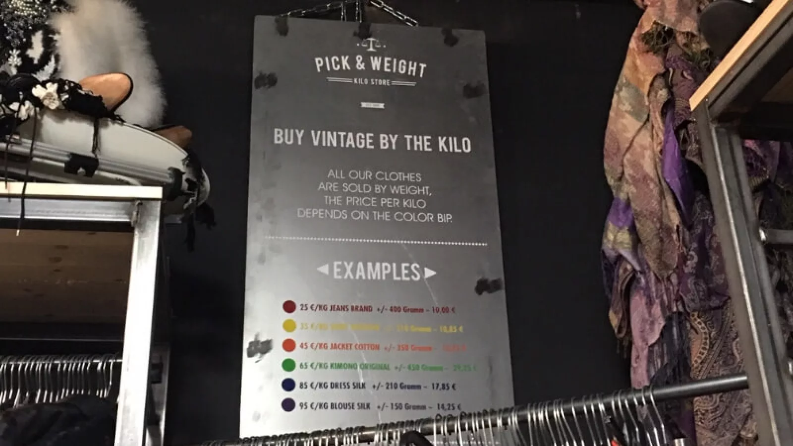 La cosa en Pickanweight es así: cada prenda del local tiene un marcador de algún color, esto representa un determinado grupo del que dependerá el costo final del producto.