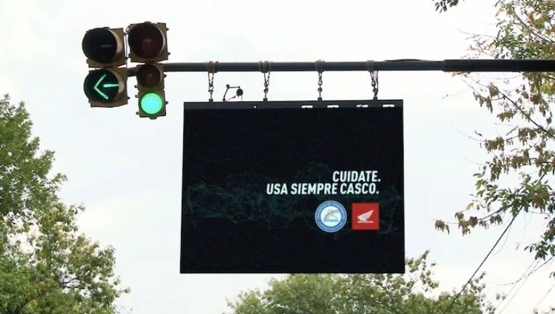 Así nace el “Semáforo Concientizador”, ubicado en Campana y que a través de pantallas ubicadas en la vía pública, frente al semáforo y mientras los vehículos están frenados por la luz roja, identifica a quienes circulan en moto sin casco y por medio de la pantalla, se les solicita que por favor se lo pongan, para que el semáforo pueda habilitarse.