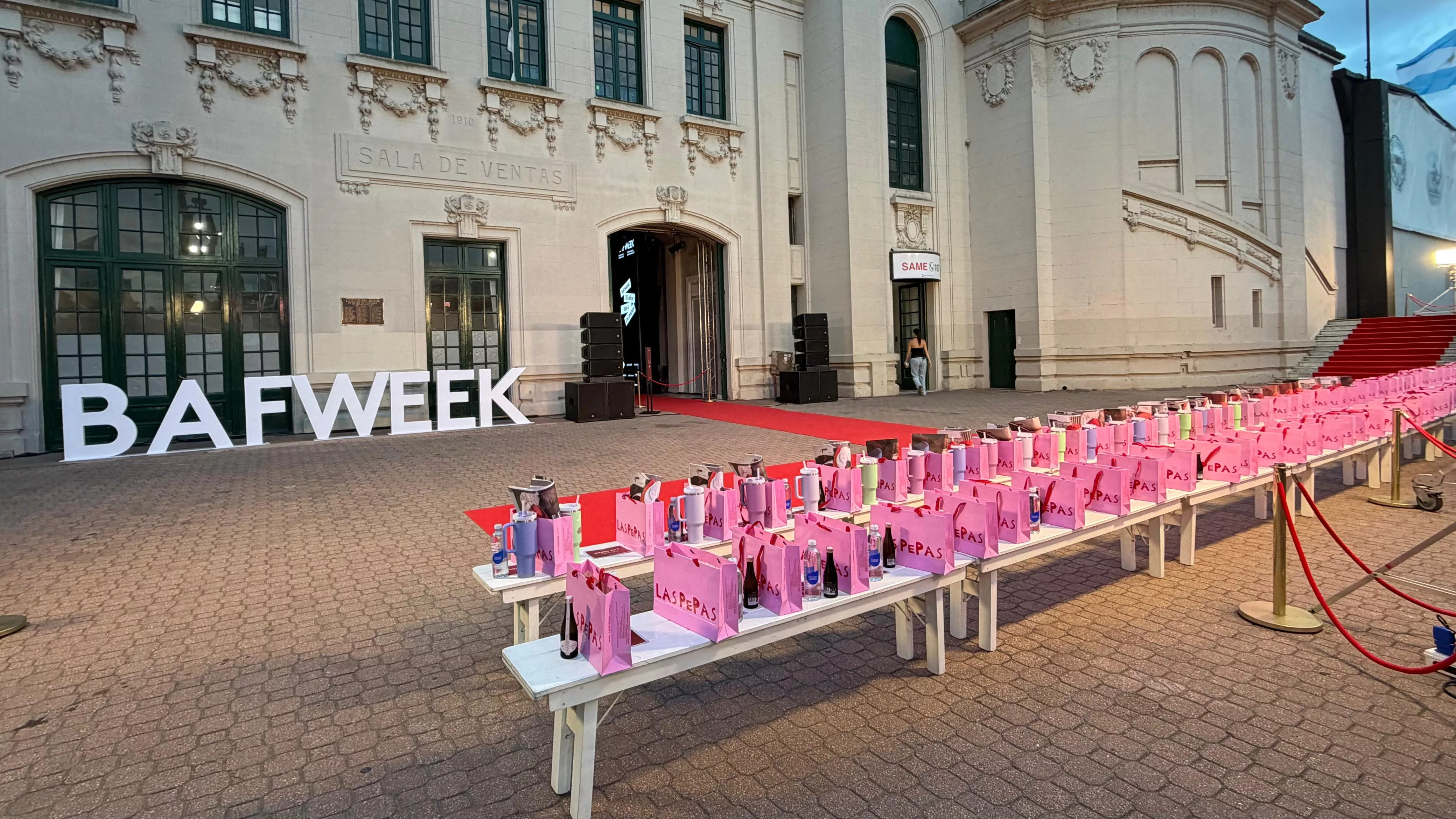 Para los invitados de la Front Row, hubo de regalo un termo Stanley Quencher, una botella de Chandon de187ml para que disfruten durante el show, y una bolsa de Las Pepas con una agenda y demás merchandising.