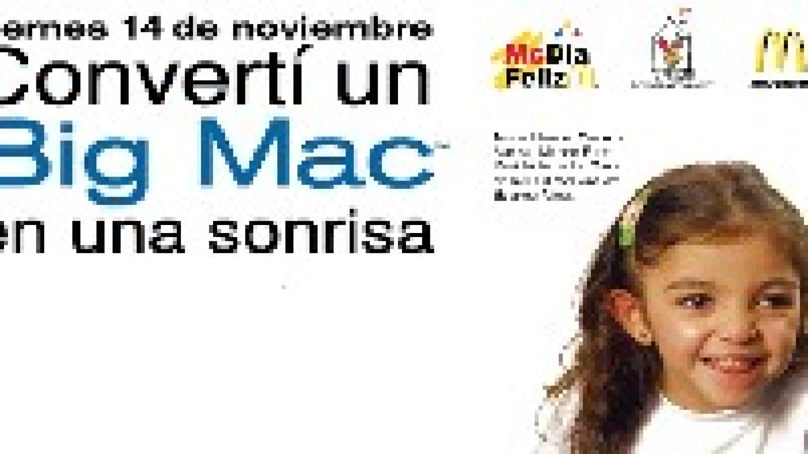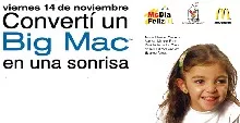 El viernes 14 de noviembre McDonald´s celebra en los más de 180 locales que tiene en la Argentina el McDía Feliz. ¿En qué consiste? Todo lo que las sucursales de McDonald recauden durante ese día por la venta de Big Mac será destinado a las Casas Ronald McDonald ubicadas en Córdoba, Mendoza y Baires, que albergan a más de 4.200 familias durante prolongados tratamientos oncológicos y transplantes infantiles. Así que ya sabés, si te comés un Big Mac ese día en cualquier McDonald, le estarás dando la mano a miles de chicos en tratamiento médico.