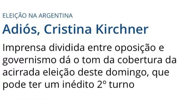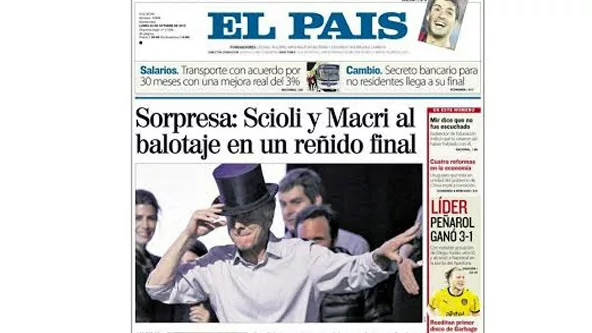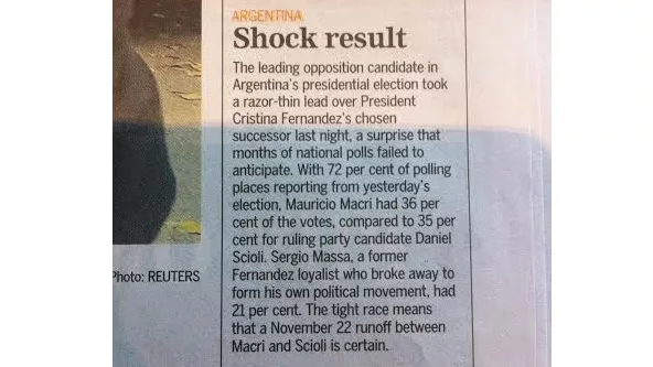 Diego Sebastian Sanchez Gould / Ginebra, Suiza: "La Radio y televisión Suiza (RTS) acaba de actualizar la información referida a las elecciones en nuestro país. Va el resumen y lo actualizare con el correr del día aunque mañana será recién reflejado en los diarios locales (si es que algo sale). El título de la nota es: Resultado sorpresa del intendente de Buenos Aires hacia la presidencia de Argentina. El candidato de la oposición Mauricio Macri revoluciona la política en Argentina con un resultado inesperado que abre la vía a una segunda vuelta de la elección presidencial. Según el resultado parcial sobre más del 86% de los votos escrutados, Mauricio Macri se ve portador de un resultado inesperado de 34,5% de los sufragios avanzando sobre el Delfín de la Presidenta Kirchner que obtiene provisoriamente el 36,7% de los votos. "Las encuestas previas se han equivocado completamente y esto es totalmente inesperado" a declarado el analista político Ignacion Labaqui. " Una victoria de Scioli, que era la tendencia de las previsiones, es actualmente claramente incierta". Una segunda vuelta con resultado abierto: La segunda vuelta tendrá lugar el 22 de noviembre próximo y Scioli, candidato del Frente para la victoria, aparece mucho más vulnerable de lo que dejan pensar las encuestas de opinión. Una nueva era se abre en Argentina después de 12 años de gobierno de Néstor Kirchner y de su esposa Cristina Kirchner, quien no podía pelear por un tercer mandato.