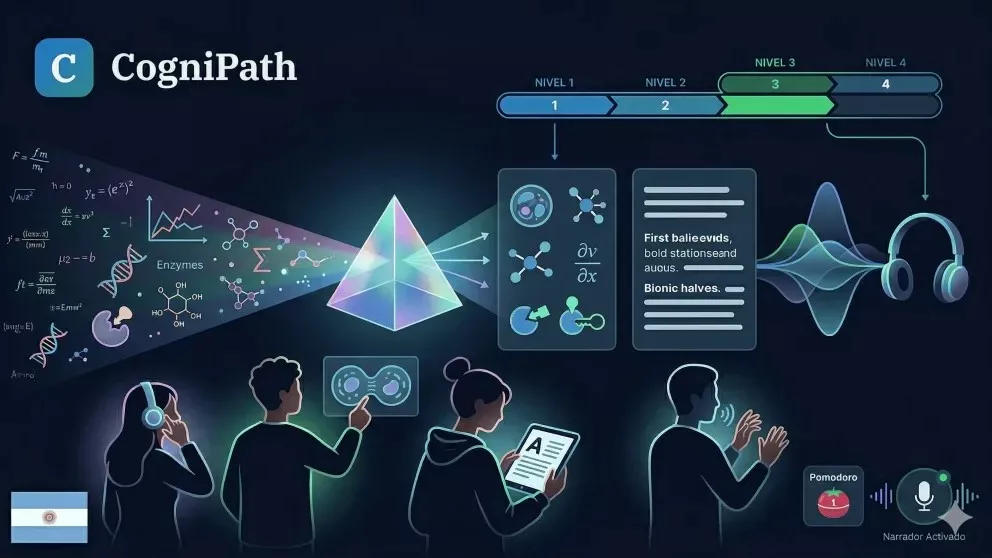 CogniPath funciona como un “traductor” de formatos educativos. Convierte gráficos, textos o conceptos complejos en versiones accesibles según la necesidad del alumno: