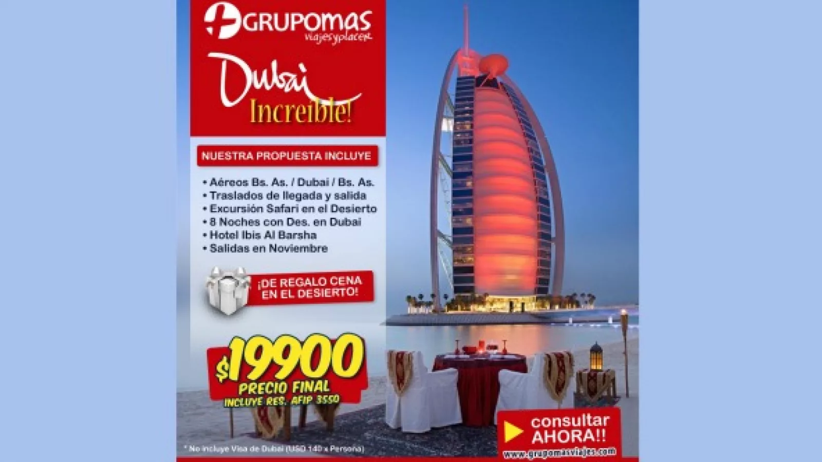 El precio final es $ 19.900 que incluye la resolución Afip 3550 pero no así el trámite de la visa de Dubai a US$ 140 por persona. “A diferencia del trámite para la visa de Estado Unidos, ésta es más simple y se obtiene en pocas semanas”, aclara el director del Grupo.
