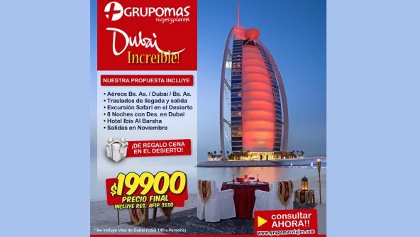 La promoción de Viajar Más incluye aéreos Buenos Aires-Dubai-Buenos Aires, traslados de llegada y salida, excursión “Safari en el Desierto”, durante ocho noches de alojamiento con desayuno incluido en el Hotel Ibis Al Barsha. Como yapa, incluyen una cena en el desierto.