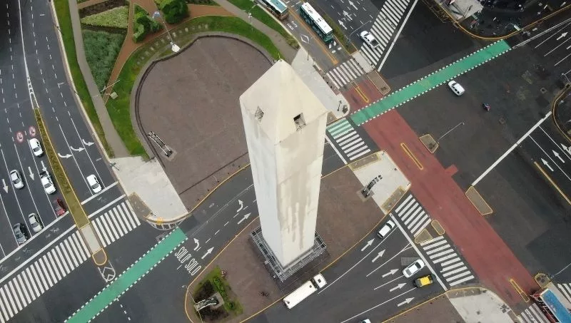 ¿Cuánta pintura se utilizó? Con una altura de 67,5 metros y una superficie total de 1360 m2 para pintar, se utilizaron más de 300 litros. También se restauraron las rejas que lo rodean a través de un tratamiento especial para poner en valor el material original de las mismas.