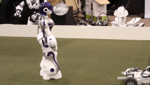 Es a lo que se dedica Playbots y es lo que está mostrando en Expomática 2011. Mesas con grandes pantallas táctiles para armar rompecabezas virtuales, aplicaciones de juegos en base a Kinetic (el dispositivo para jugar de modo gestual de Microsoft) y sus vedettes, los pequeños humanoides y animaloides –junto a sus robots espías-.