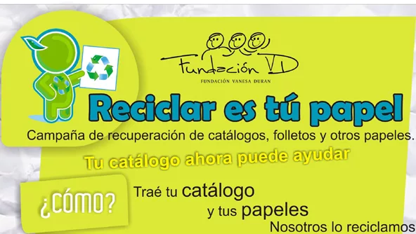¿Cuántas empresas pueden decir que se hacen cargo de los desechos que producen? La Fundación Vanesa Durán decidió, bajo esa premisa, realizar una campaña de reciclado recuperando todos sus catálogos, folletos y otros papeles que distribuyó en todo el país. “Reciclar es TU papel” es el nombre de la campaña que en un mes de actividad ya recuperó 2.300 kilos de papel, el cual es juntado por agentes recolectores, que son los mismos Regionales Independientes de la empresa.