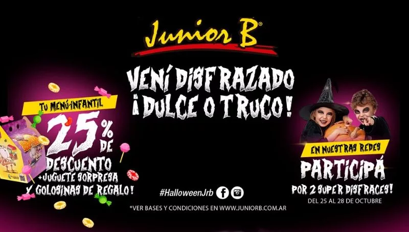 Mañana llega Hallowen y para celebrarlo Junior B lanzó promociones para todos sus locales. Este jueves los niños que concurran a las sucursales disfrazados -o con algún objeto referido al festejo- tendrán un 25% de descuento en la opción infantil, ya sean desayunos, meriendas o menús de almuerzo/cena. Además, junto a la sorpresa que acompaña cada juguete se incluirá de regalo un paquete de golosinas.