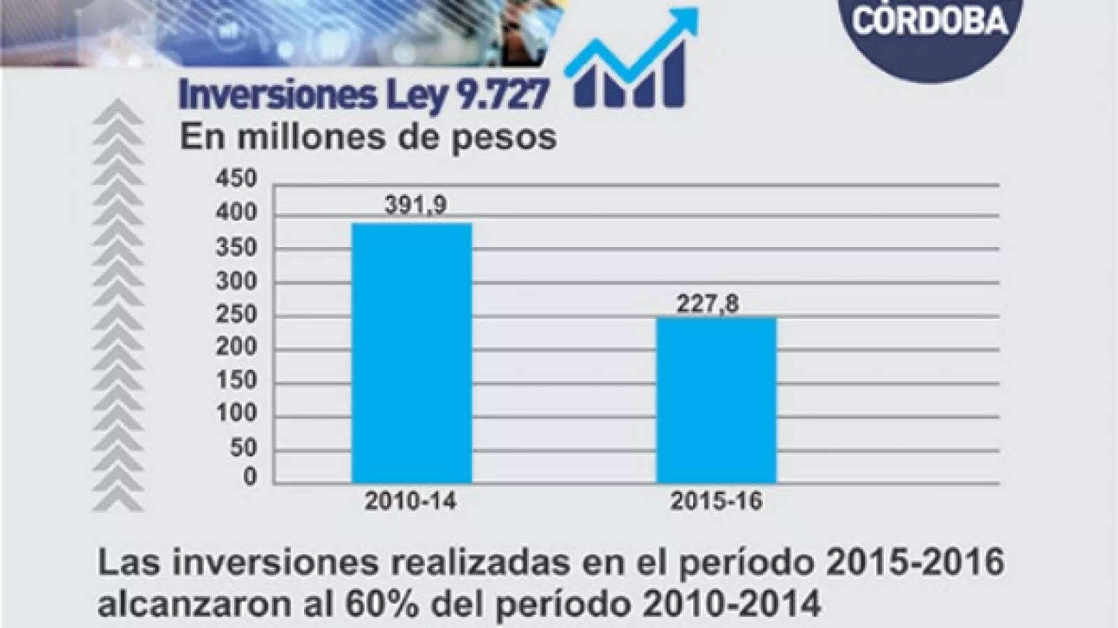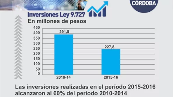En enero del año 2010 entró en vigencia la Ley 9727 denominada “Programa de Promoción y Desarrollo Industrial de Córdoba”. Hasta diciembre del 2016, 204 pequeñas y medianas empresas industriales, realizaron una inversión de $670,8 millones que le permitieron acceder a los beneficios de la promoción industrial.