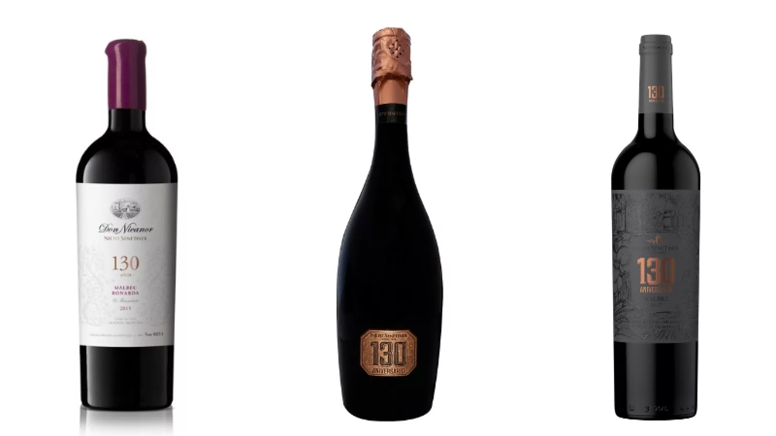 - Nieto Senetiner Malbec 130 años: Vino cosechado en Luján de Cuyo, donde se encuentra la bodega. Tanto la etiqueta del vino como su estuche se diseñaron con ilustraciones que simbolizan la historia de la bodega, los viñedos y toneles. Se venderá en formato 1.5 litros (con estuche especial) a un precio sugerido de $ 1.220 y en el clásico formato 750 ml a $ 370.