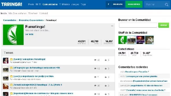 3) Fumatinga: los miembros hablan sobre el cultivo de cannabis, derechos del consumidor, razones para legalizar la marihuana, etc. Organizan encuentros taringueros y en agenda tienen el “Cannapicnic Fumatinga”. (Es la 8° comunidad con más miembros de Taringa!, son cerca de 50.000 usuarios).