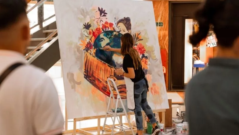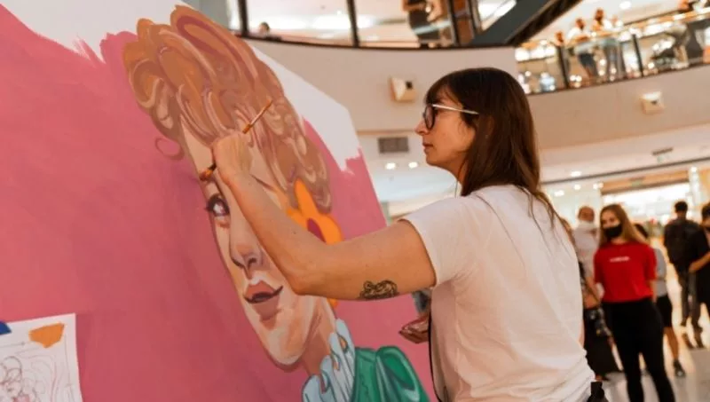 Munino y Solchum son quienes dieron vida a las obras en conmemoración a las mujeres este lunes en Patio Olmos Shopping. Durante una jornada de más de 4 horas se encargaron de realizar sus intervenciones artísticas en vivo, proceso del cual pudieron disfrutar quienes recorrían el centro comercial.