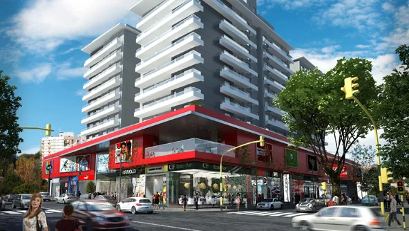 Se trata de un emprendimiento de 28.000 m2 que contempla 7.000 m2 de shopping, tres torres de 10 pisos de departamentos y dos subsuelos con parking con capacidad de 200 autos.