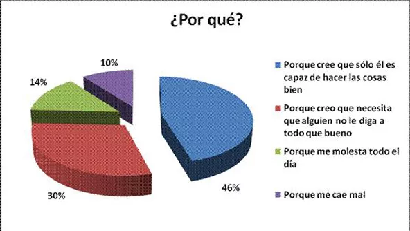 De los que quieren decirle “váyase a la punta del cerro y déjeme hacer mi trabajo”, “renuncio” o “hágalo usted mismo”, un 46% lo haría porque su jefe cree que sólo él es capaz de hacer las cosas bien, un 30% porque cree que su jefe necesita que alguien no le diga a todo que “bueno”, un 14% porque su jefe lo molesta todo el día y un 10% porque le cae mal.