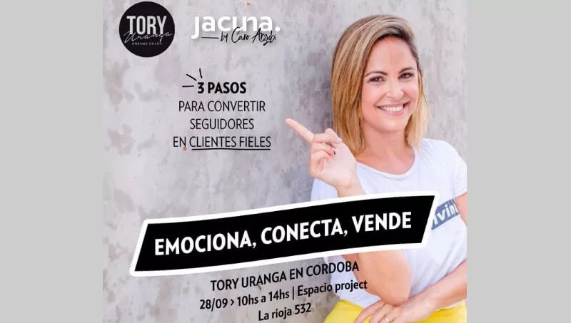 “Emociona, Conecta, Vende” es el nombre de la gira de eventos de Tory Uranga (@toryuranga), quien pasará por Córdoba el próximo 28 de septiembre. Tory trae un taller presencial para emprendedores con el título: “3 pasos para convertir seguidores en clientes fieles”.