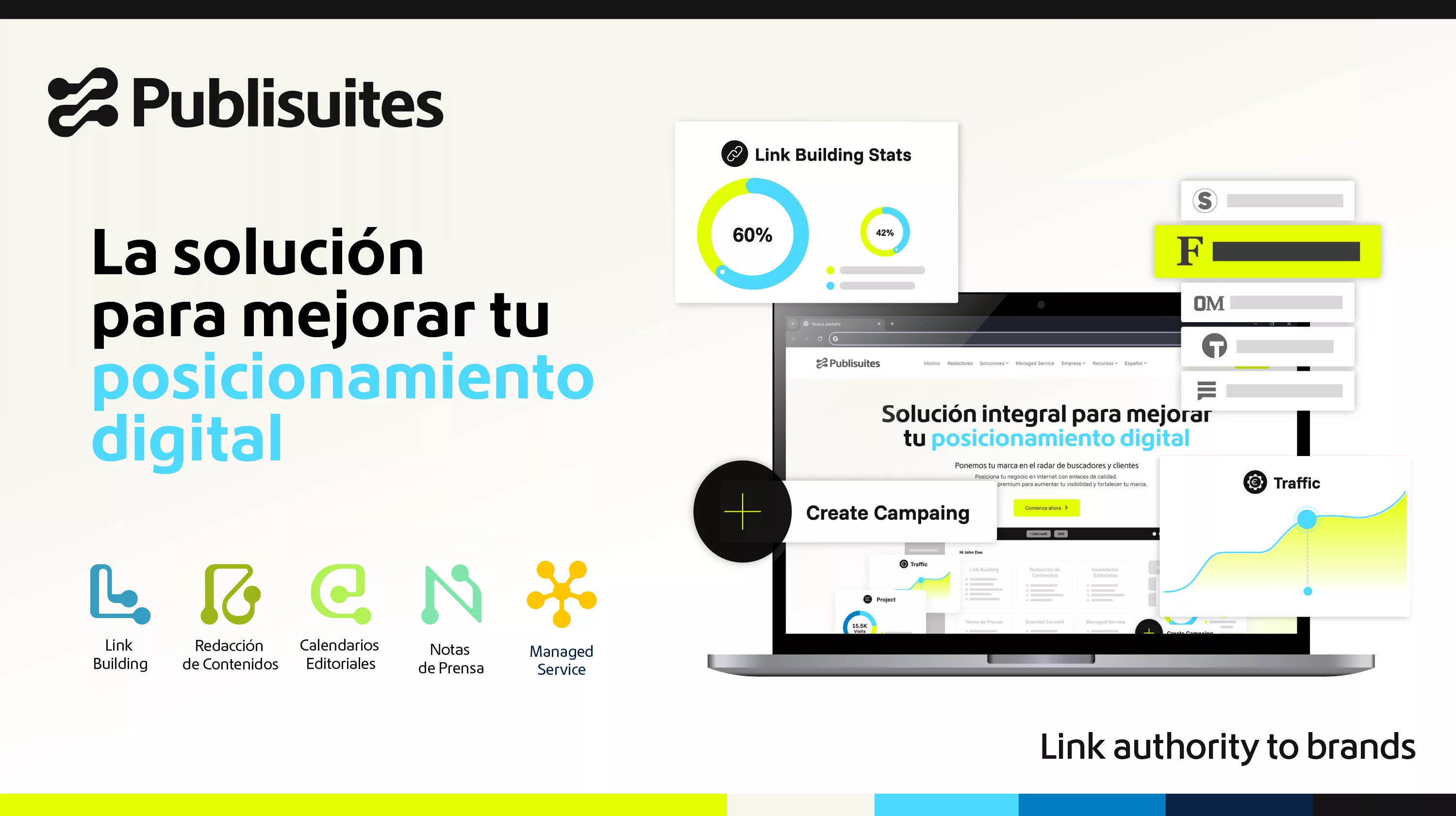Más allá del SEO tradicional, Publisuites impulsa una visión integral del marketing digital que combina link building estratégico, branded content de valor y tecnología desarrollada in-house. Una fórmula que va más allá de mejorar la visibilidad en buscadores: posiciona marcas relevantes, confiables y con propósito.