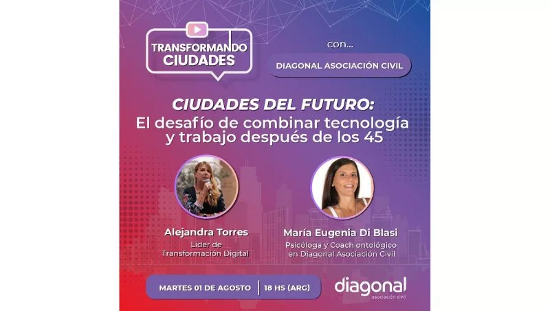 El próximo martes 1° de agosto a las 18 horas se desarrollará el tercer encuentro del ciclo, llamado “Ciudades del Futuro: El desafío de combinar tecnología y trabajo después de los 45”, que tendrá como invitada a María Eugenia Di Blasi, licenciada en Psicología y Psicopedagogía con orientación cognitivo-conductual y coach ontológico profesional, quien tiene más de 10 años de experiencia como mentora y facilitadora de talleres de inserción, reinserción y reinvención laboral- ocupacional, tanto para el sector público, privado y organizaciones no gubernamentales. En Diagonal Asociación Civil se desempeña como coach y facilitadora de talleres sobre herramientas para la empleabilidad de personas + 45 años y talleres en organizaciones sobre diversidad y convivencia intergeneracional para líderes, recursos humanos y colaboradores.