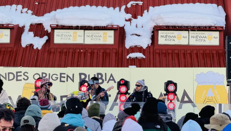 La banda Gauchito Club fue la encargada de musicalizar el evento donde se presentó la nueva receta de Andes Origen Rubia, en la terraza del Hotel Escorpio, en Las Leñas, Mendoza.