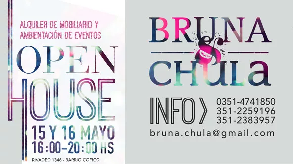 Bruna Multiespacio y Casa Chula se unieron para crear Bruna & Chula, una tienda de alquiler de mobiliario y ambientaciones para eventos sociales y corporativos. La inauguración oficial será el el viernes 15 y sábado 16 de mayo entre las 16 y 20 horas con un Open House en su local de Rivadeo 1346 (Barrio Cofico) y allí se podrá apreciar la oferta disponible, disfrutar de buena música y muchas sorpresas. Entrada libre y gratuita.