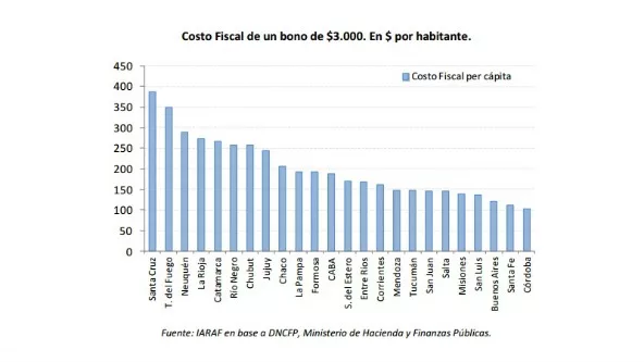 El Instituto Argentino de Análisis Fiscal (Iaraf) elaboró un detallado informe sobre el costo fiscal y el impacto en término de algunos ingresos habituales que reciben las provincias (Coparticipación y Fondo Federal Solidario), la erogación de un bono de fin de año de $3000 a los empleados públicos de las provincias argentinas.