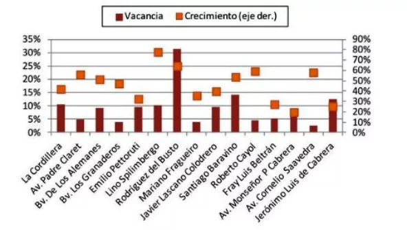 Sumando a la avenida Rafael Núñez, cuyo índice de vacancia es del 10%, se relevaron 1.821 locales en total, de los cuales 132 están desocupados, lo que da un promedio de vacancia del 7,25%.