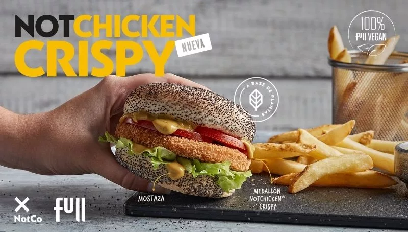 El medallón vegetal logra replicar las características de textura y sabor del pollo a partir de ingredientes vegetales como arvejas, trigo, garbanzos, bambú, choclo y durazno. Acompañado de un pan con semillas de amapolas e ingredientes frescos, la nueva NotChicken Crispy trae una propuesta 100% vegana para todos aquellos clientes que deseen probarla.